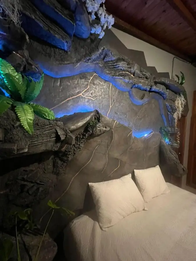 Sumérgete en la magia de esta habitación inspirada en la naturaleza, donde el diseño combina elementos rústicos con un toque moderno y envolvente. La imponente pared con textura rocosa iluminada con luces azules crea un ambiente sereno y exclusivo, mientras que las plantas integradas refuerzan la conexión con la belleza natural.